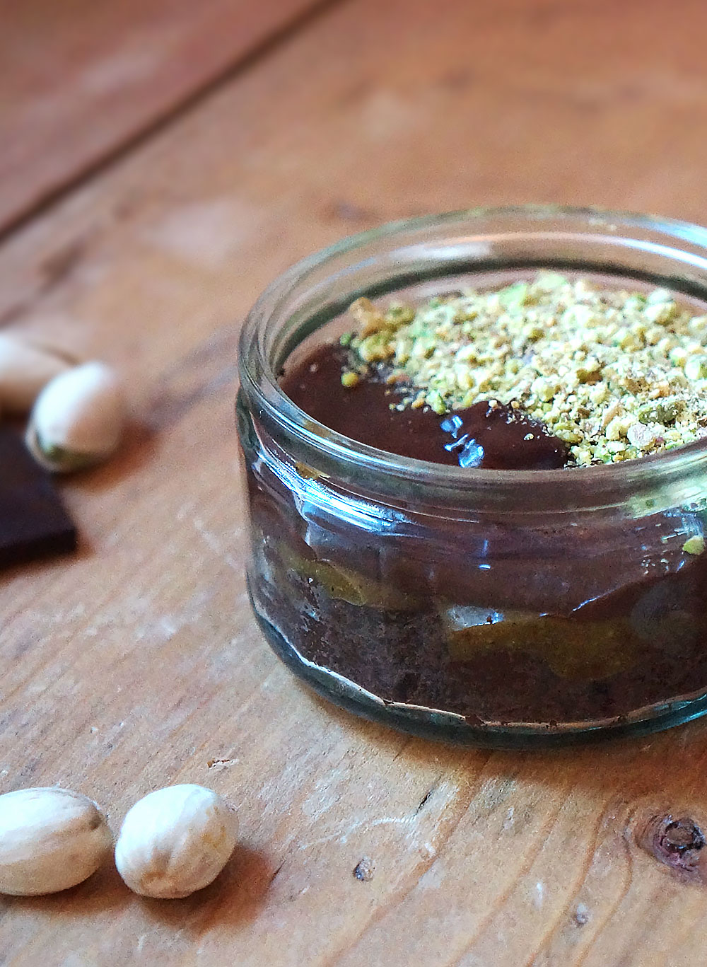 The caramel will cool as you make the chocolate filling. For this, heat the sugar (1 tbsp) and cream (100 ml) until the cream is about to boil. Add this to a glass bowl containing the chocolate (70g) and butter (30g) and stir until everything is combined in to a glossy liquid. Whisky in the egg yolk and vanilla essence and you’re done. Just pour the chocolate mixture in to the tarts/ ramakins and top with crushed pistachios.
